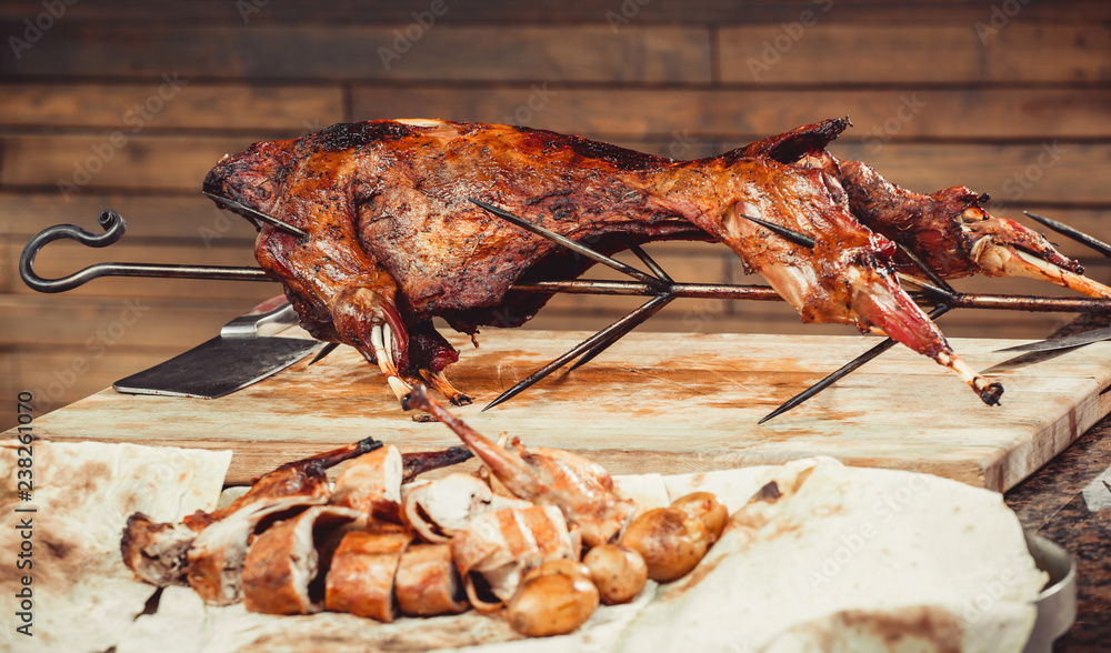 Whole grilled lamb on cutting board. Hot Meat dishes