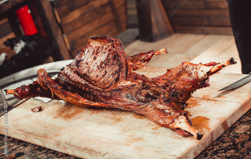 Whole grilled lamb on cutting board. Hot Meat dishes