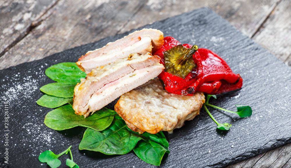 Chicken breast stuffed with cheese and ham with spinach and sweet pepper on stone slate background on wooden background close up. Hot Meat Dishes. Top view