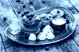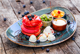 Pink pancakes with honey, chocolate, jam, whipped cream, berries and fruits on plate. Traditional Russian cuisine at the Pancake week or Shrovetide. Healthy breakfast