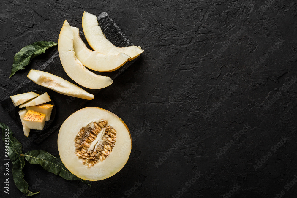 Yellow melon on black stone background. Colorful fresh fruit. Top view, flat lay, copy space