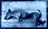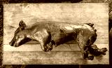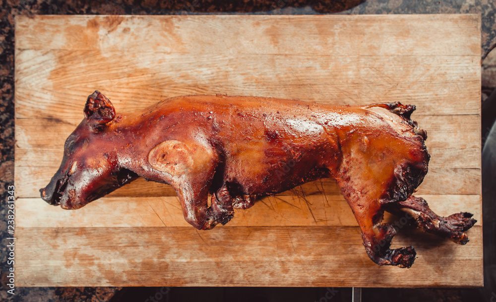 Whole grilled pig with meat steak on cutting board. Hot Meat. Top view