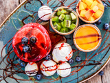 Pink pancakes with honey, chocolate, jam, whipped cream, berries and fruits on plate. Traditional Russian cuisine at the Pancake week or Shrovetide. Healthy breakfast. Flat lay. Top view
