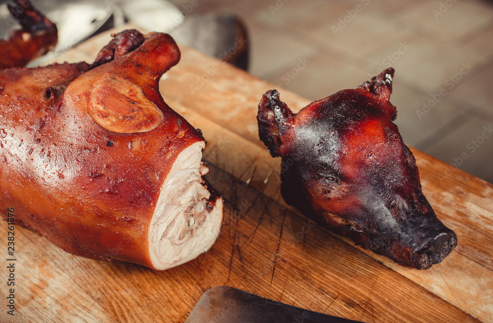 Whole grilled pig with meat steak on cutting board. Hot Meat