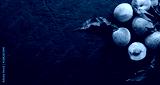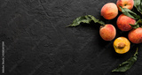 Ripe peaches on black stone background. Healthy food concept, top view, copy space