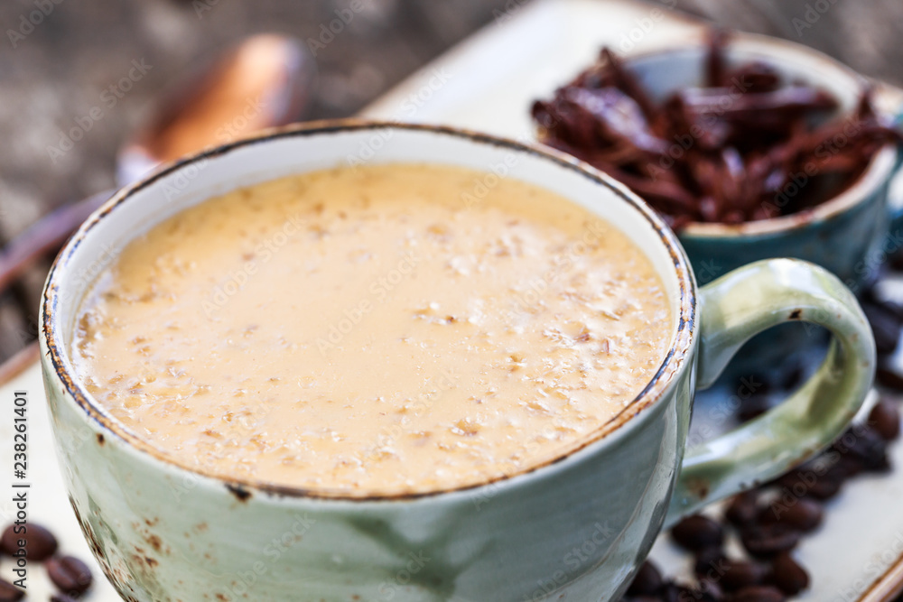 Oatmeal porridge with coffe and grated chocolate on bright wooden table. Selective focus. Healthy breakfast, vegan food