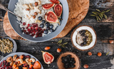 Rice coconut porridge with figs, berries, nuts, dried apricots and coconut milk in plate on rustic wooden background. Healthy breakfast ingredients. Clean eating, vegan food concept, top view