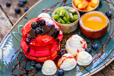 Pink pancakes with honey, chocolate, jam, whipped cream, berries and fruits on plate. Traditional Russian cuisine at the Pancake week or Shrovetide. Healthy breakfast