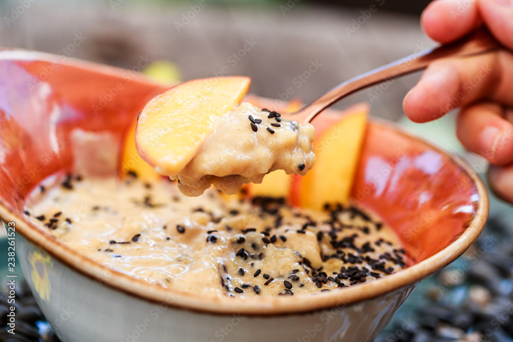 Woman eating oatmeal porridge sunflower seeds, sesame and peaches. Selective focus. Healthy breakfast, vegan food
