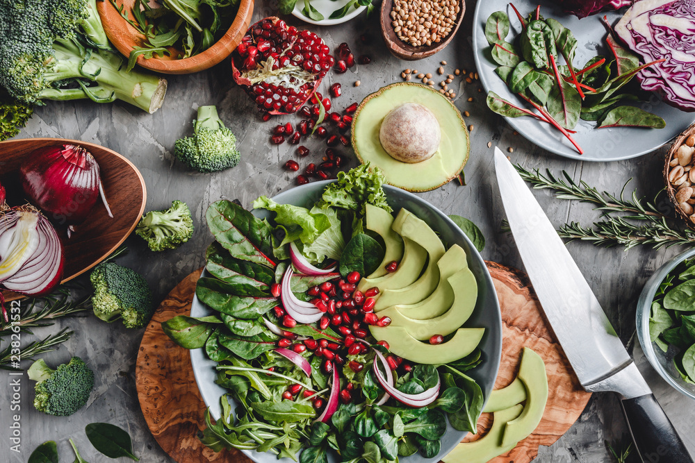 Healthy fresh salad with avocado, greens, arugula, spinach, pomegranate in plate over grey background. Healthy vegan food, clean eating, dieting, top view