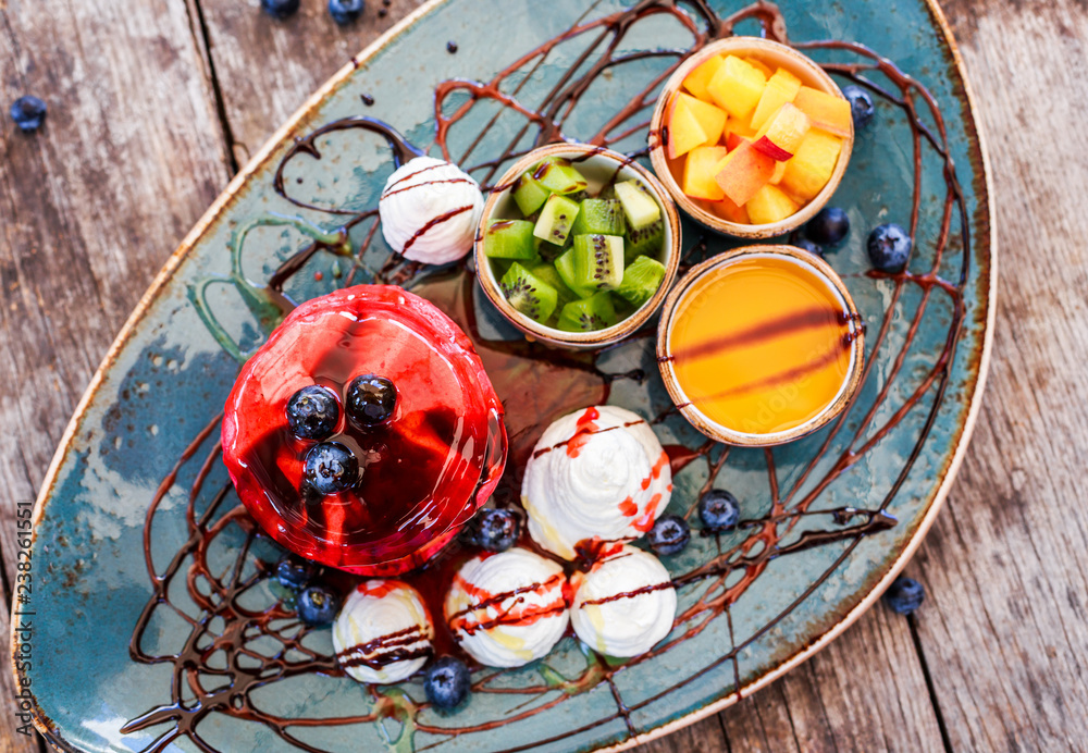 Pink pancakes with honey, chocolate, jam, whipped cream, berries and fruits on plate. Traditional Russian cuisine at the Pancake week or Shrovetide. Healthy breakfast. Flat lay. Top view