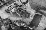 Cutting grilled lamb on wooden table with knife. Top view. Hot Meat dishes
