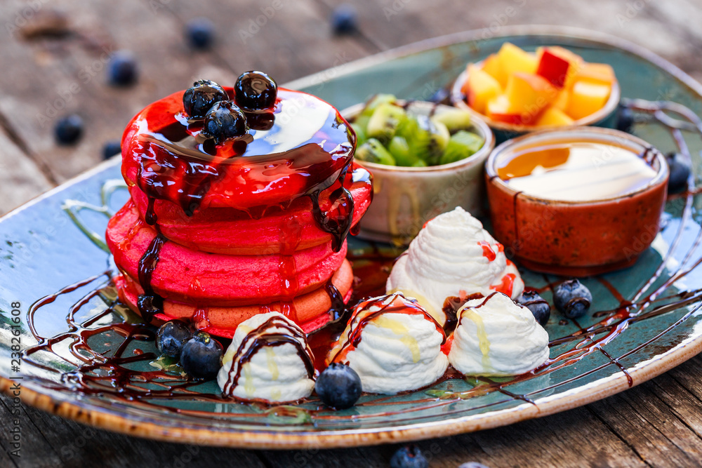 Pink pancakes with honey, chocolate, jam, whipped cream, berries and fruits on plate. Traditional Russian cuisine at the Pancake week or Shrovetide. Healthy breakfast