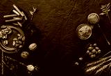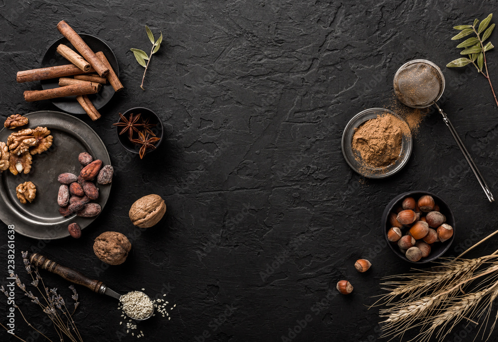 Mix of nuts and spices for baking cakes in bowl and spoon, cinnamon, star anise, hazelnuts, walnuts, wheat, lavender on dark stone table. Organic food, top view, space for text