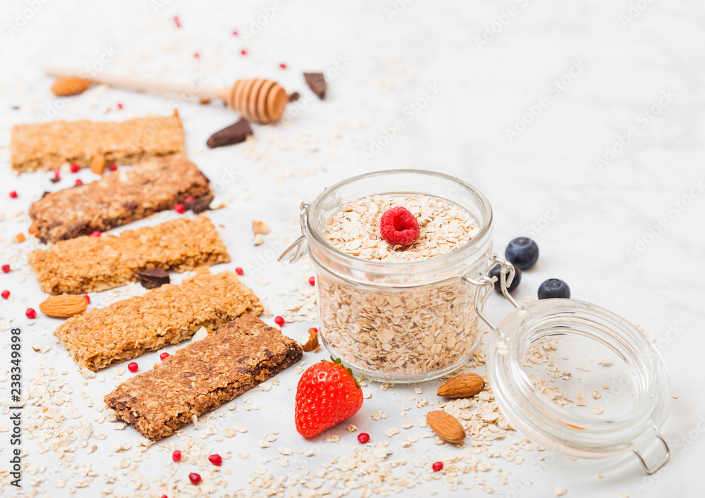 Organic cereal granola bar with berries with honey spoon and jar of oats on marble background. Top view. Strawberry, raspberry and blueberry with almond nuts.