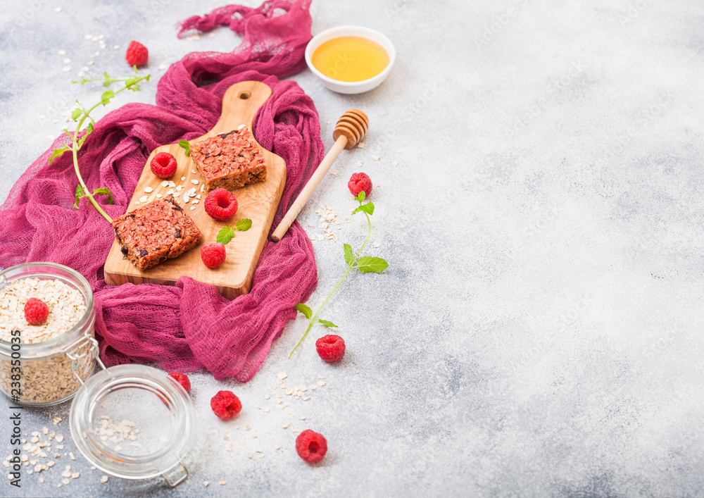 Organic cereal fruit granola bar with berries on vintage board with honey spoon and jar of oats on purple cloth. Strawberry, raspberry and blueberry with mint leaf and bowl of honey. Space for text