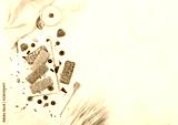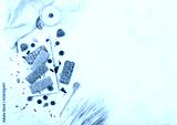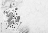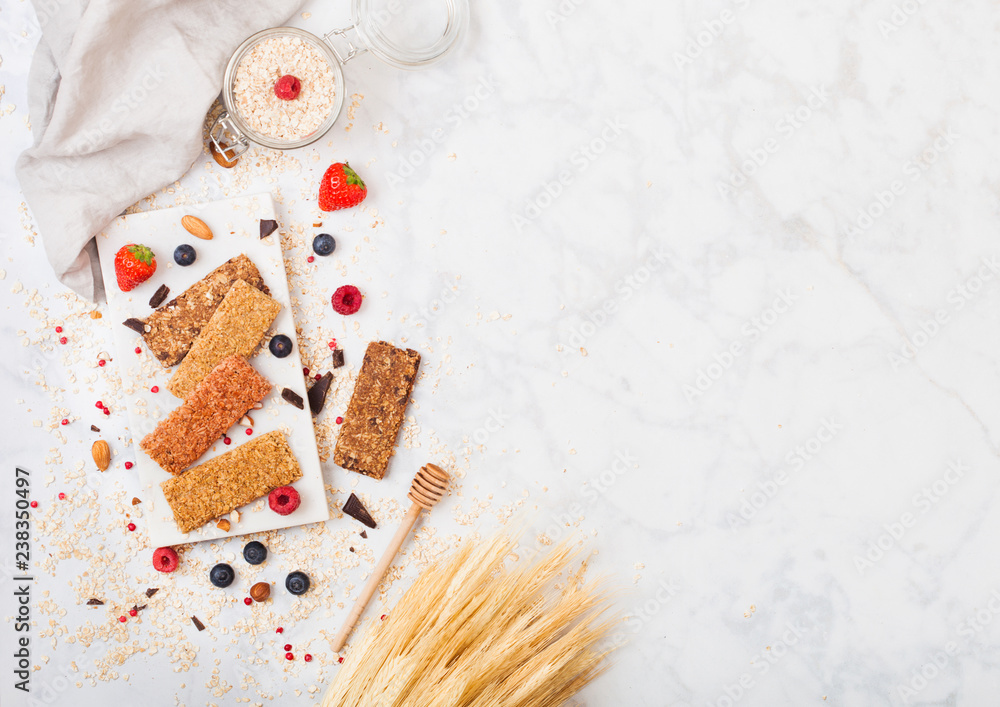 Organic cereal granola bar with berries on marble board with honey spoon and jar of oats and linen towel on marble background. Space for text.Top view