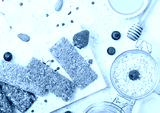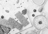 Organic cereal granola bar with berries on marble board with honey spoon and jar of oats and coconut on marble background.