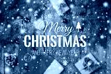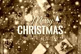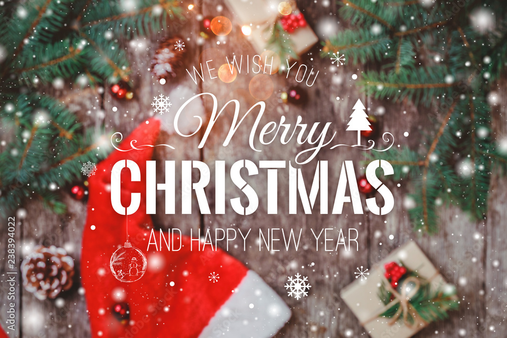 Christmas composition with red Santa hat, Fir branches, pine cones, decorations, snowflakes on wooden background. Xmas
