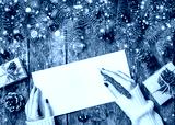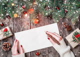 Female hand writing a letter to Santa on wooden background with Christmas gifts, Fir branches and candy. Xmas and Happy New Year card. Flat lay, top view