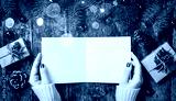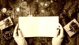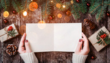 Female hand writing and reading a letter to Santa on wooden background with Christmas gifts, Fir branches and candy. Xmas and Happy New Year card. Flat lay, top view