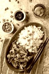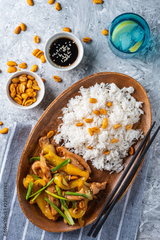 Kung Pao chicken, stir-fried Chinese sichuan traditional sichuan dish with chicken, peanuts, vegetables and chili peppers.
