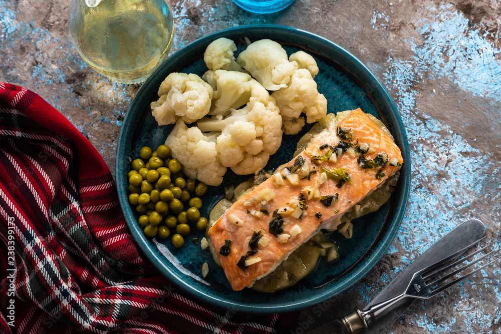 Solomon fillet with pineapple and cauliflower. Fish with vegetables.