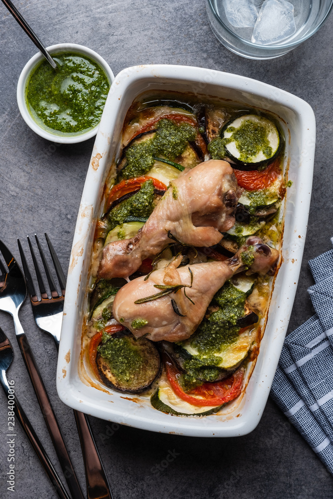 Ratatouille with chicken and pesto. French cuisine. Rosemary chicken with oven-roasted ratatouille.