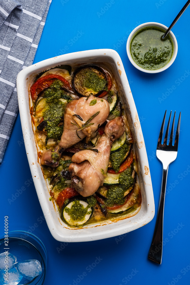 Ratatouille with chicken and pesto. French cuisine. Rosemary chicken with oven-roasted ratatouille.