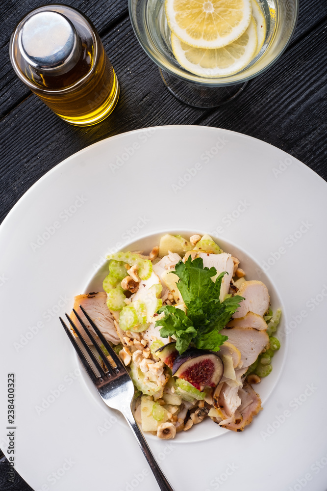 Grilled chicken breast salad with figs, green apple, celery, nuts and Parmesan.