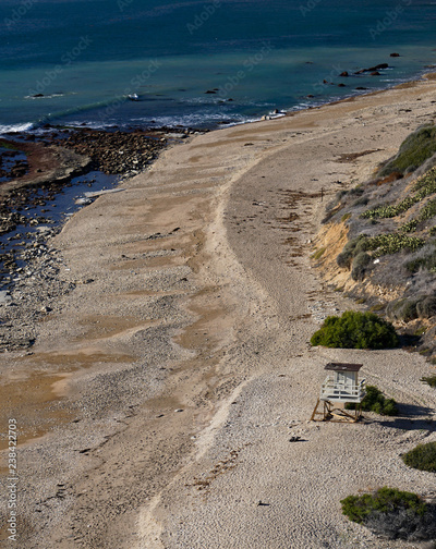 A curve of empty Pacific Ocean beach at low tide with an empty lifeguard shack in California on a sunny autumn day illustrates concepts of peace, tranquility and solitude.