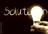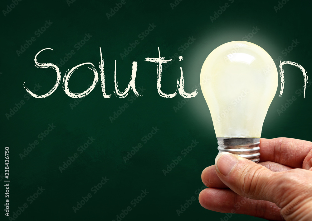 Hand Holding Lighted Bulb With Solution on Chalk Board and Copy Space
