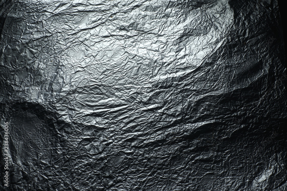 Thin wrinkled sheet of crushed tin aluminum silver foil background texture
