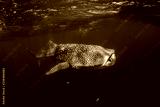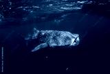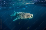 Huge whale shark swimming and feeding close to the ocean's surface with snorkelers swimming nearby