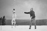 Man playing with dog in winter landscape