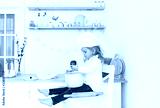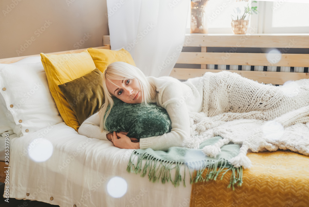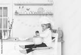 Little girl in apron and cap of the cook sitting in the kitchen in the house. Photo in interior.