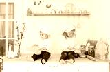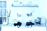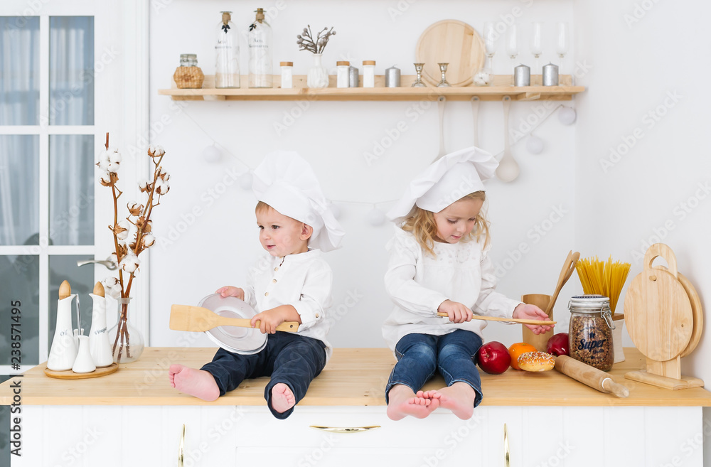 Little brother and sister in the cook's caps sitting in the kitchen in the house. Mother's helpers.