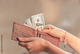 beautiful female hands take a few American dollar bills from the men's brown leather purse, the dengbags are half-visible from the purse, beautiful lighting, colored background, daylight