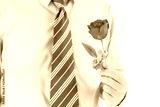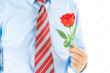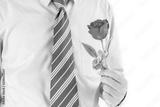 Man holding red rose in hand on white