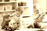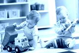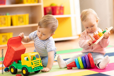 Kids playing with educational toys. Children sit on a rug in a play room at home or kindergarten. Toddler boy with toy lorry and baby girl with rings.