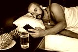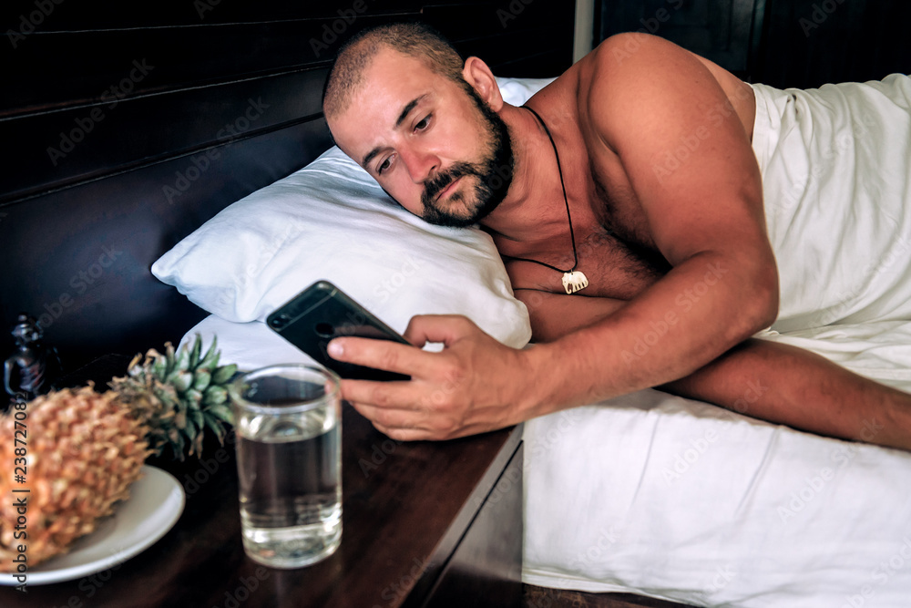woken up man with smartphone