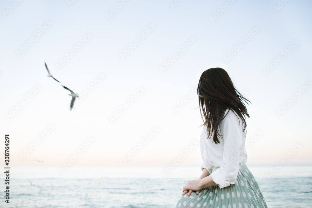 Marine female portrait. Attractive woman in green skirt walks along the shore before the sea while gulls fly over her