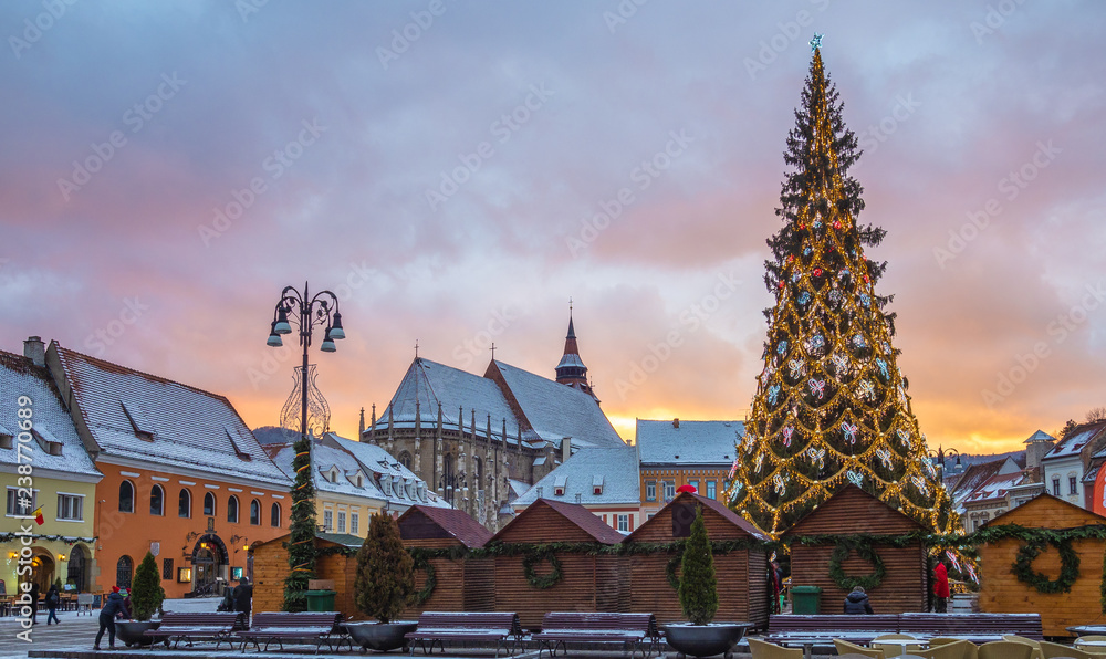 Christmas market and decorations tree in center of Brasov town, Transylvania, Romania