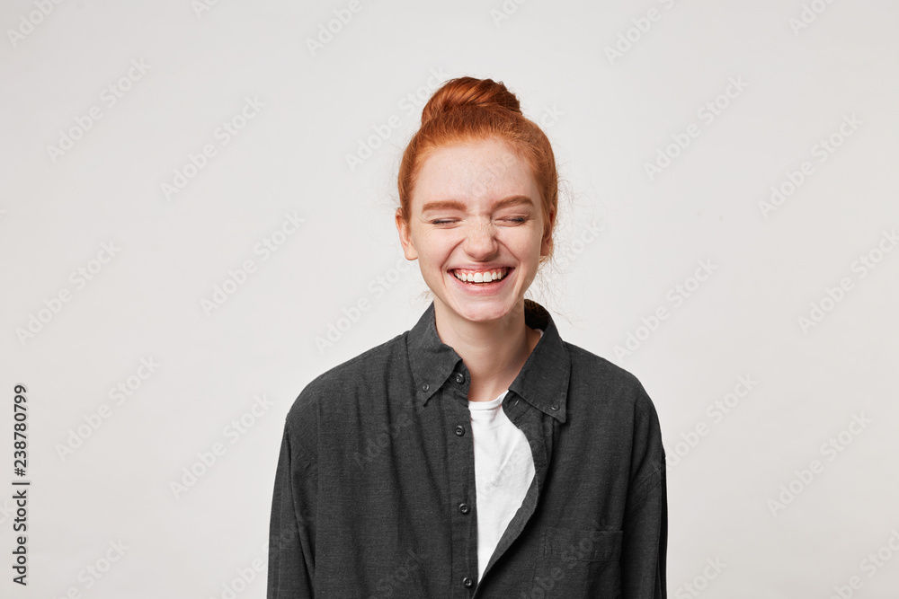 Cheerful resilient red-haired girl with a bun at her head laughs sincerely, having closed her eyes, dressed in a simple black shirt, is isolated on white background