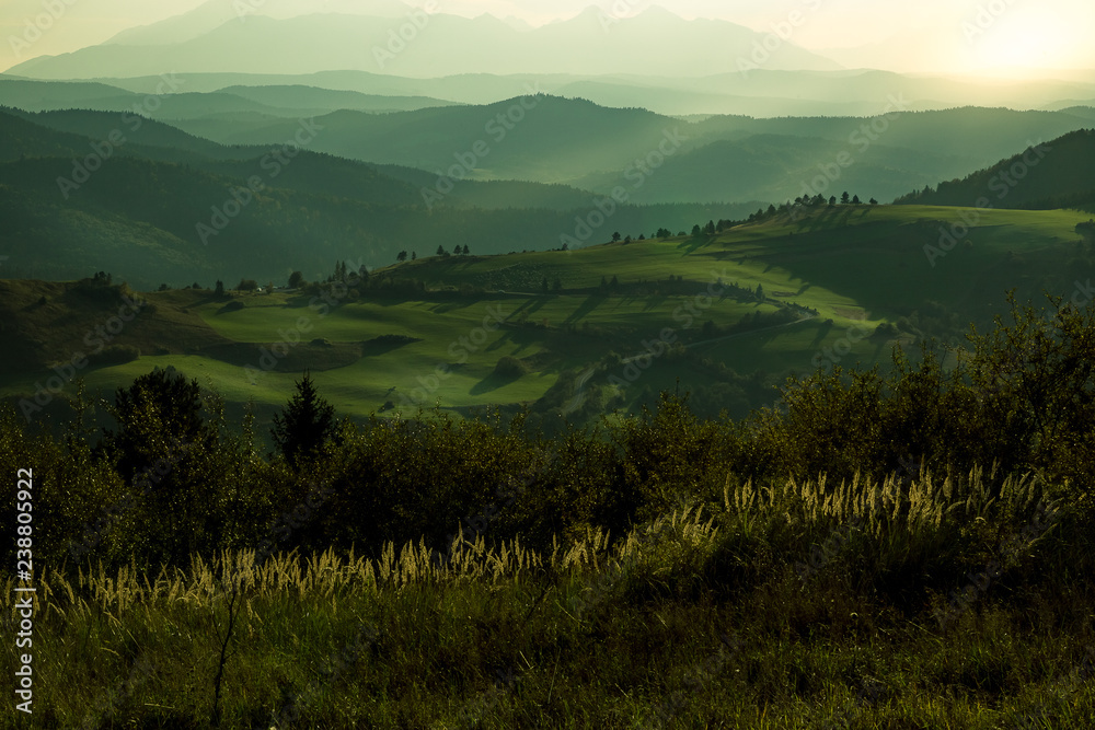 Zielone wzgórza rozświetlone pięknymi promieniami zachodzącego słońca