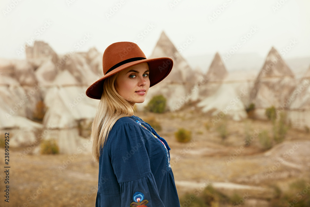 Fall Fashion. Beautiful Woman In Hat, Dress In Nature Portrait