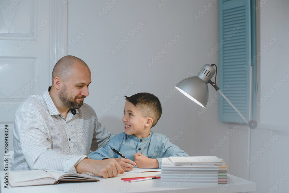 Father and son work together on school homework or homeschooling.