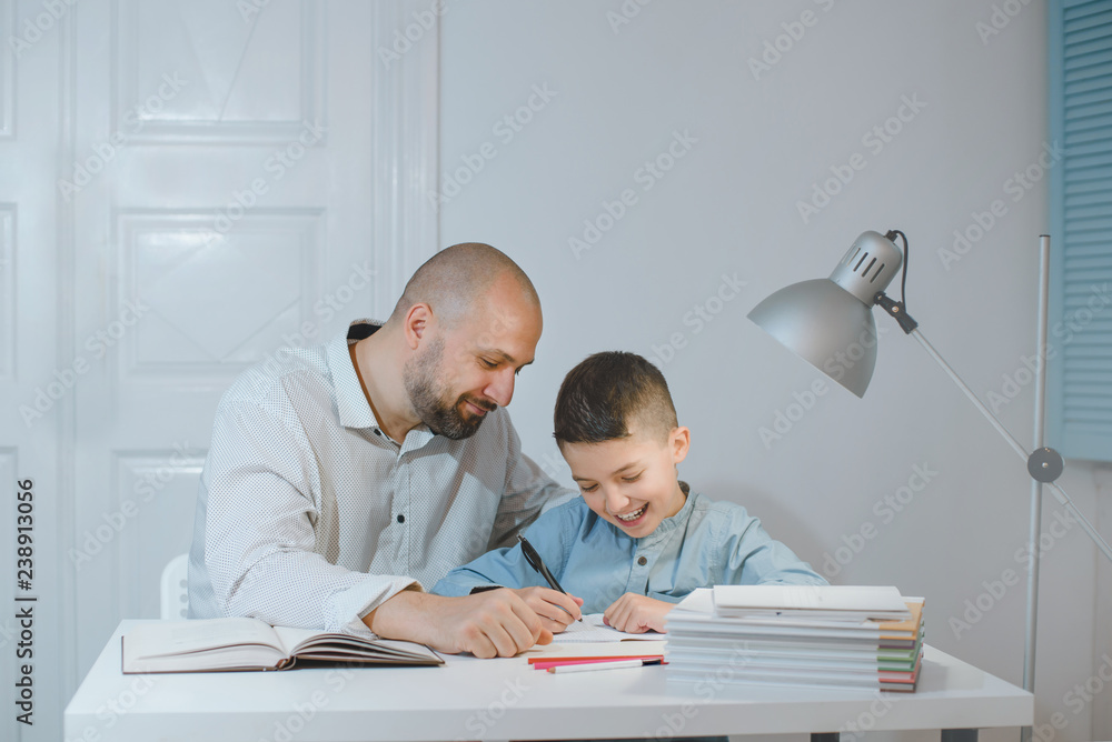 Father and son work together on school homework or homeschooling.