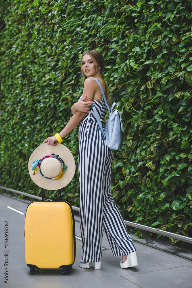 Young stylish Caucasian woman at the airport with a yellow suitcase and a straw hat.