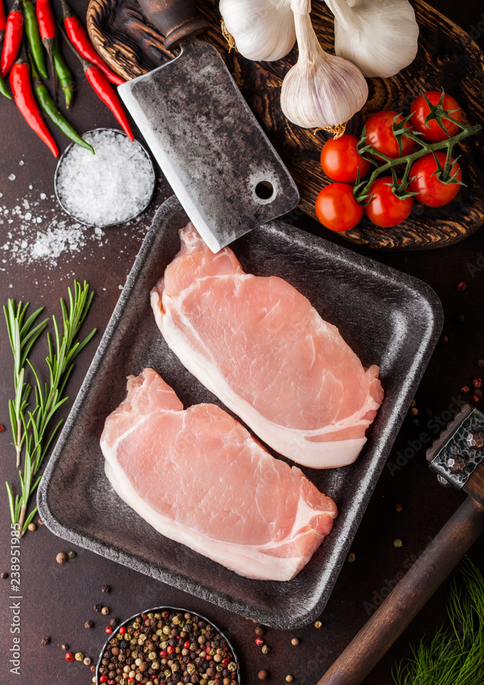 Raw pork loin chops in plastic tray with salt and pepper and vintage meat hatchets and hammer on rusty background.Red pepper, tomatoes and garlic.
